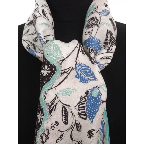 Both canting (hand-drawn tool) and copper stamp are used for applying malam (hot wax) to create the design on this rayon scarf. The fabric is then hand dipped in dye for a few times to achieve the color intended. The fabric covered by wax resist the dye. This process is repeated for each color, then fabric is dipped in boiling water to remove the wax and dried under the sunlight to bring out the vibrant color. The wax then going through recycling process to be re-used. See Batik Art for more info.