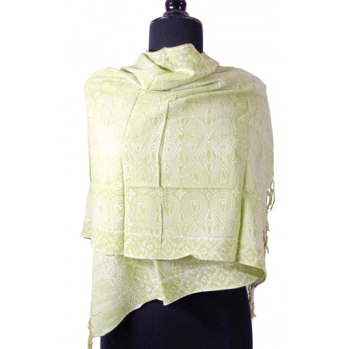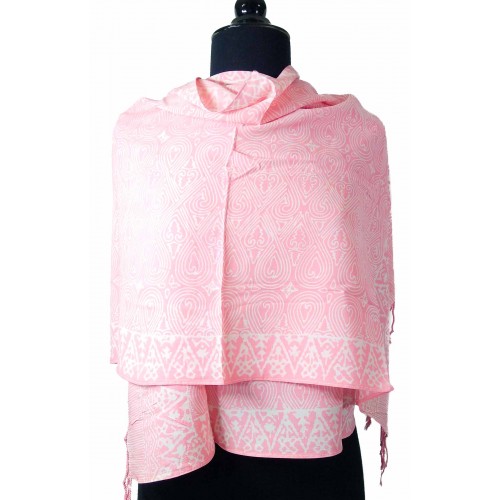 Both canting (hand-drawn tool) and copper stamp are used for applying malam (hot wax) to create the design on this rayon scarf. The fabric is then hand dipped in dye for a few times to achieve the color intended. The fabric covered by wax resist the dye. This process is repeated for each color, then fabric is dipped in boiling water to remove the wax and dried under the sunlight to bring out the vibrant color. The wax then going through recycling process to be re-used. See Batik Art for more info.